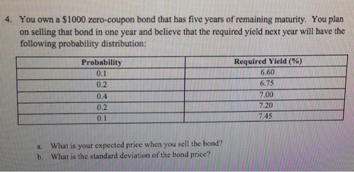 How to Calculate the Price of Coupon Bond? - WallStreetMojo The present value is computed by discounting the cash flow using yield to maturity. Mathematically, it the price of a coupon bond is represented as follows, Coupon Bond = ∑i=1n [C/ (1+YTM)i + P/ (1+YTM)n] Coupon Bond = C * [1- (1+YTM)-n/YTM + P/ (1+YTM)n] You are free to use this image on your website, templates etc, Please provide us with an ... How do I Calculate Zero Coupon Bond Yield? (with picture) The zero coupon bond yield is easier to calculate because there are fewer components in the present value equation. It is given by Price = (Face value)/ (1 + y) n, where n is the number of periods before the bond matures. This means that you can solve the equation directly instead of using guess and check. The yield is thus given by y = (Face ... How to Calculate Yield to Maturity of a Zero-Coupon Bond Consider a $1,000 zero-coupon bond that has two years until maturity. The bond is currently valued at $925, the price at which it could be purchased today. The formula would look as follows: =...